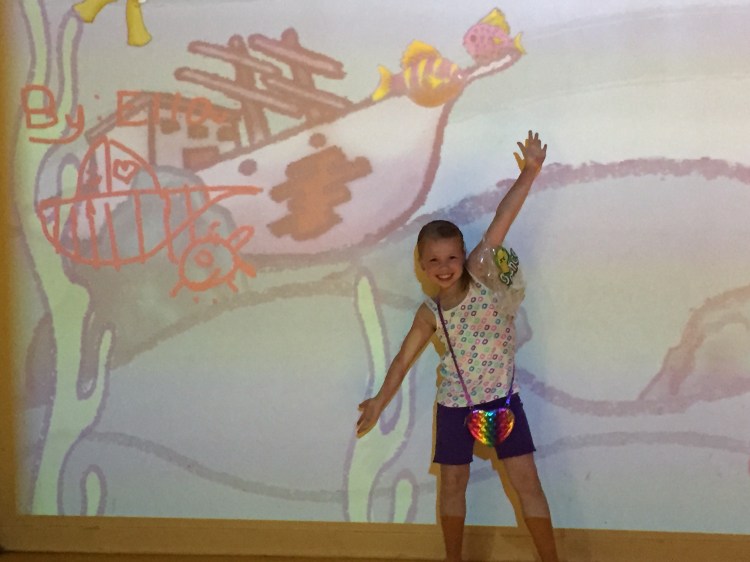 Some of the other fun things was a large projection area that had a scene on the wall. There was a large group of tablets you could draw an image or colour pictures and they would then show up in the scene.